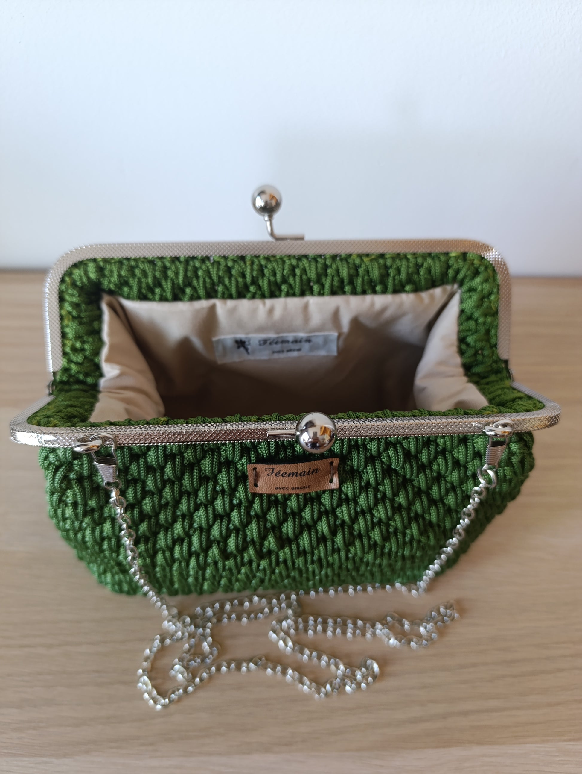 Élégance intemporelle et charme naturel se rencontrent dans le sac Alyss. Confectionné à la main en fil satin vert profond, son point texturé offre un relief délicat et raffiné. La monture métallique finement gravée et la chaine argentée amovible lui donnent un caractère à la fois chic et vintage. Parfait pour sublimer une tenue de jour comme de soirée, Alyss incarne l'alliance entre artisanat et féminité.
