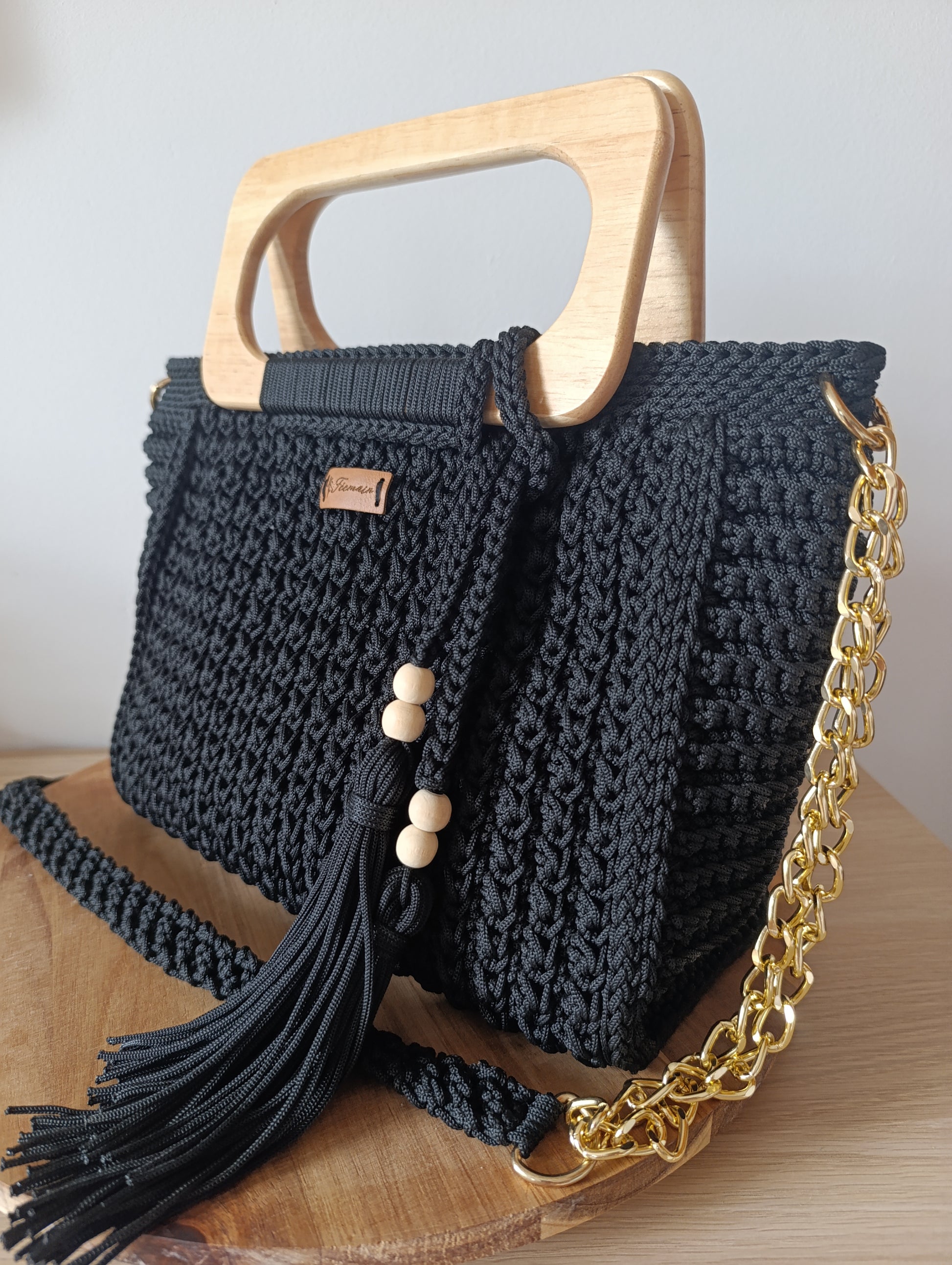 Sobriété, élégance et caractère.Ce sac noir crocheté à la main se distingue par ses anses en bois naturel,sa chaine dorée et ses détails raffinés.Le mélange des textures en fait une pièce unique, parfaite pour les femmes qui aiment allier authenticité et style.